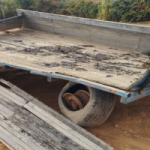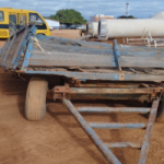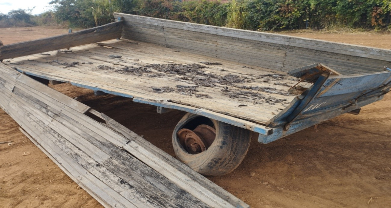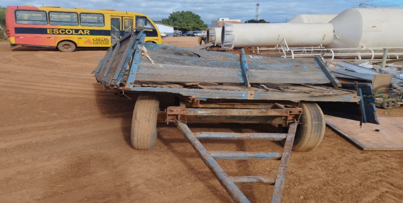 Uma carreta para trator de pneus, com dois eixos, carroceria de madeira.