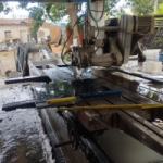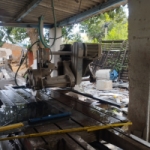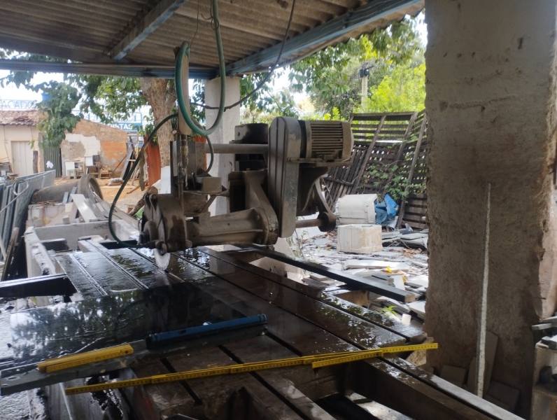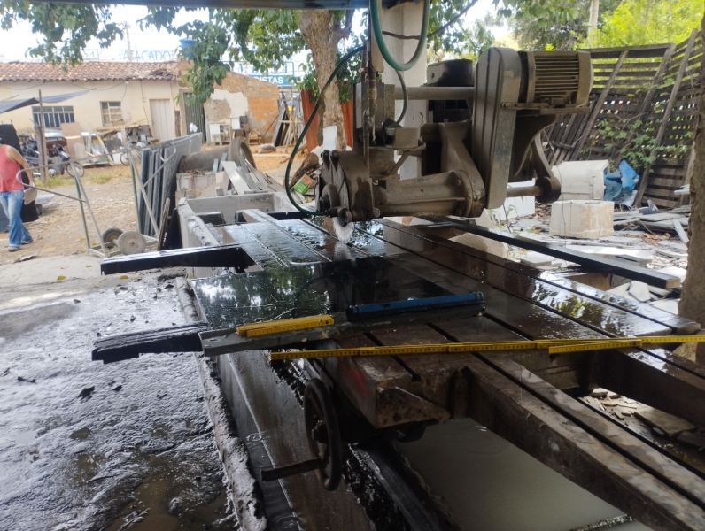 Uma máquina industrial de cortar granito e mármore, da marca Mecânica Mathias, com dois motores elétricos. Depositário: Alisson Gomes de Souza – endereço: Av. Dulce Sarmento n° 1.534 – Bairro: Vila Ipiranga, Montes Claros – MG.