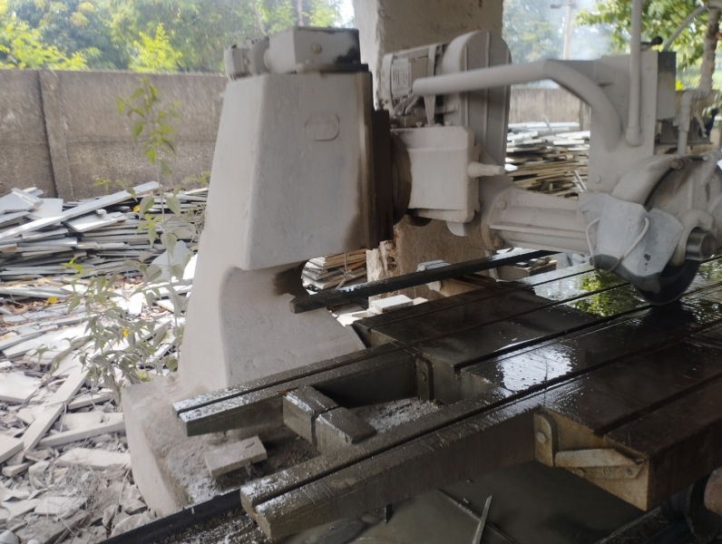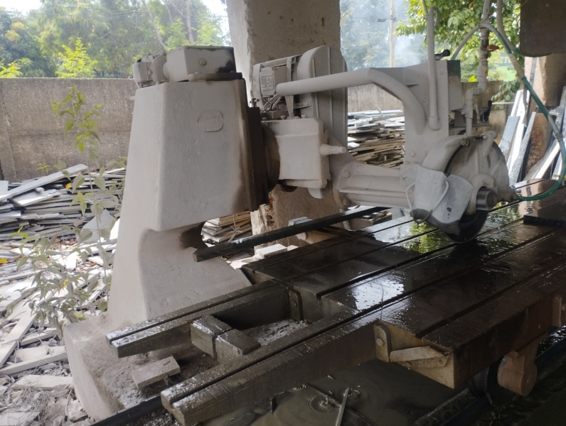 Uma máquina industrial de cortar granito e mármore, da marca Mecânica Mathias, com dois motores elétricos